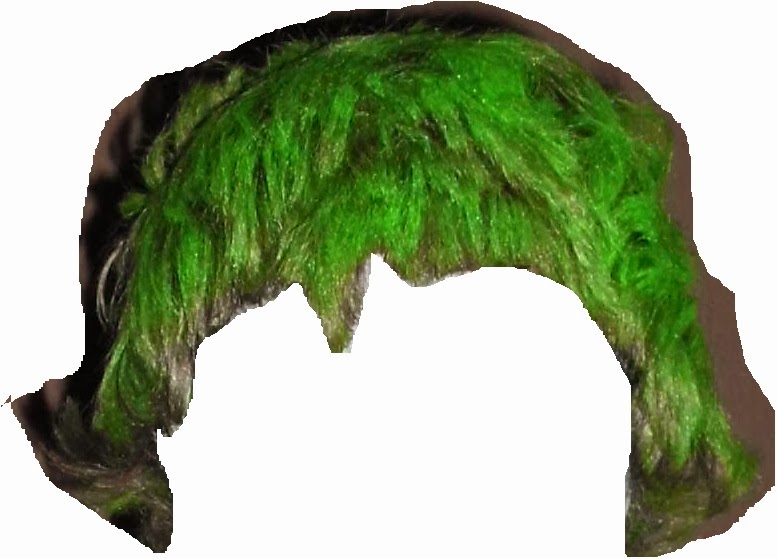 I tried a number of ways to make the wig less curly (boiling water, ironing, etc), but it just wouldn't give up its intense curl. So at the last minute I found a short, mullet-like blonde wig at a thrift store on a half-off Halloween sale for only $1.50, cut the hair to give it Captain Planet's signature front curl, and spray-painted it with green hair spray I also found at the 99 Cents Only store.